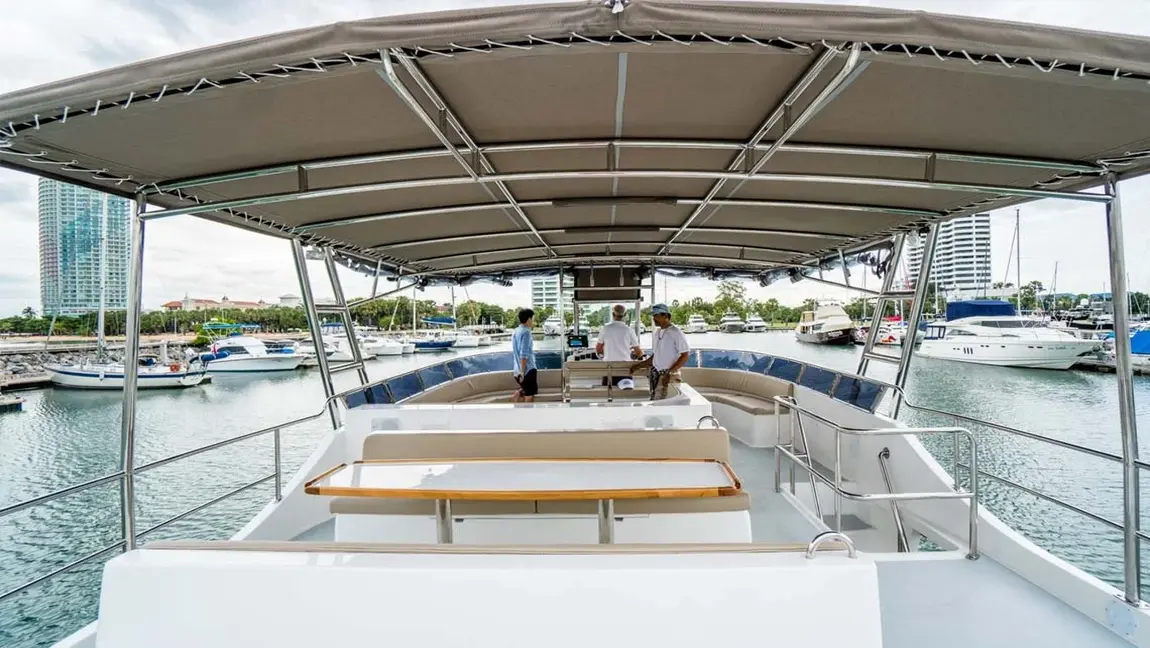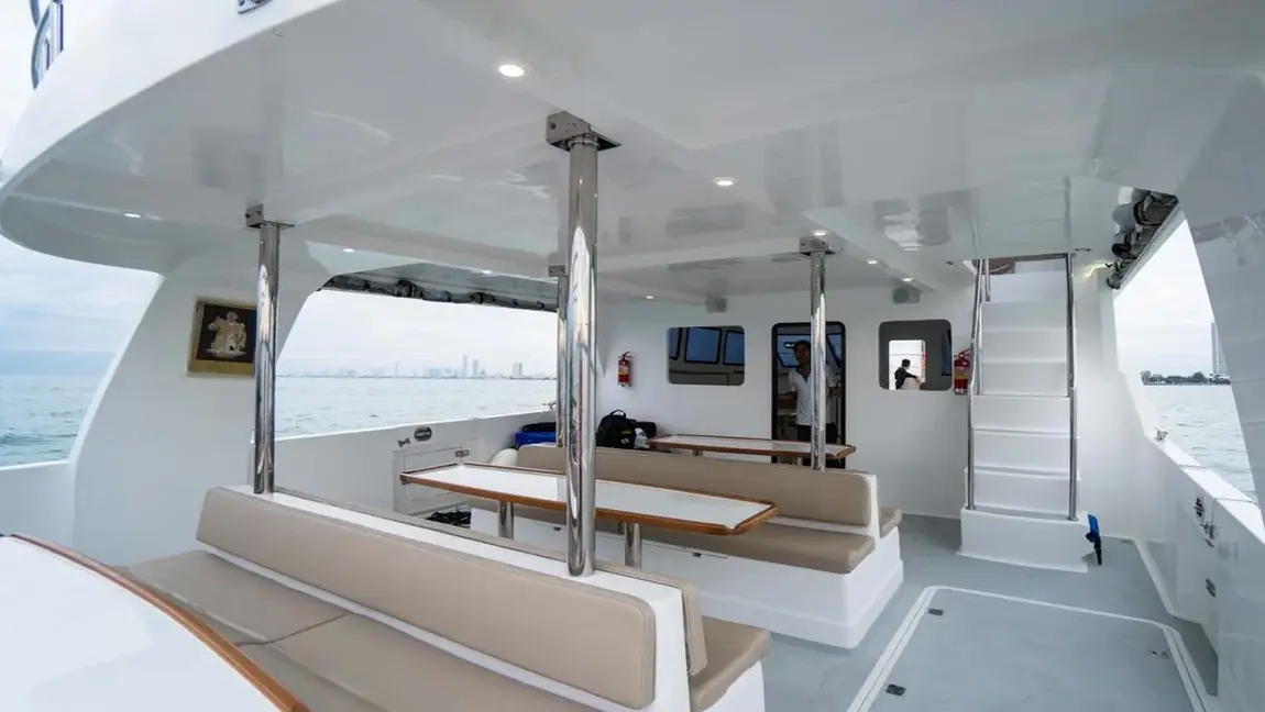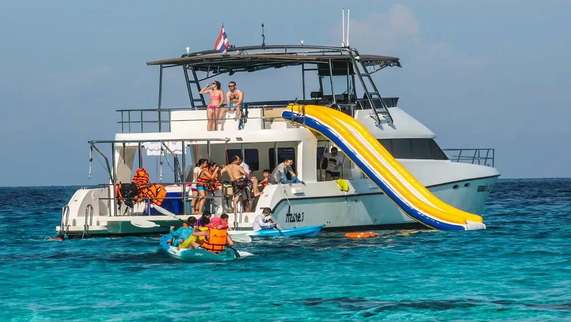 Azure 3 – Power yacht catamaran ออกแบบมาเพื่อความหรูหราขั้นสุดและพื้นที่ใช้สอยที่กว้างขวางเป็นพิเศษ เหมาะสำหรับการสังสรรค์กลุ่มใหญ่ ปาร์ตี้ส่วนตัว หรือการพักผ่อนระดับพรีเมียมในทะเลอันดามัน สัมผัสความเสถียรและความสะดวกสบายครบครัน พร้อมสไลเดอร์และเครื่องเล่นทางน้ำที่เตรียมไว้ให้คุณอย่างเต็มที่