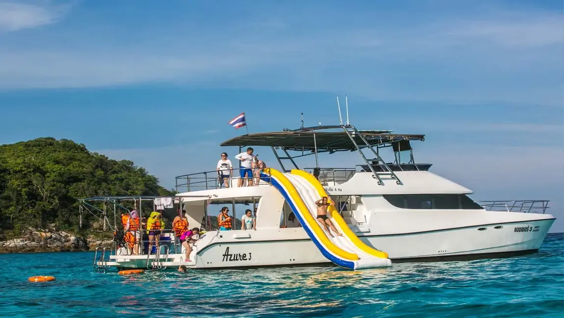 Azure 3 – Power yacht catamaran ออกแบบมาเพื่อความหรูหราขั้นสุดและพื้นที่ใช้สอยที่กว้างขวางเป็นพิเศษ เหมาะสำหรับการสังสรรค์กลุ่มใหญ่ ปาร์ตี้ส่วนตัว หรือการพักผ่อนระดับพรีเมียมในทะเลอันดามัน สัมผัสความเสถียรและความสะดวกสบายครบครัน พร้อมสไลเดอร์และเครื่องเล่นทางน้ำที่เตรียมไว้ให้คุณอย่างเต็มที่